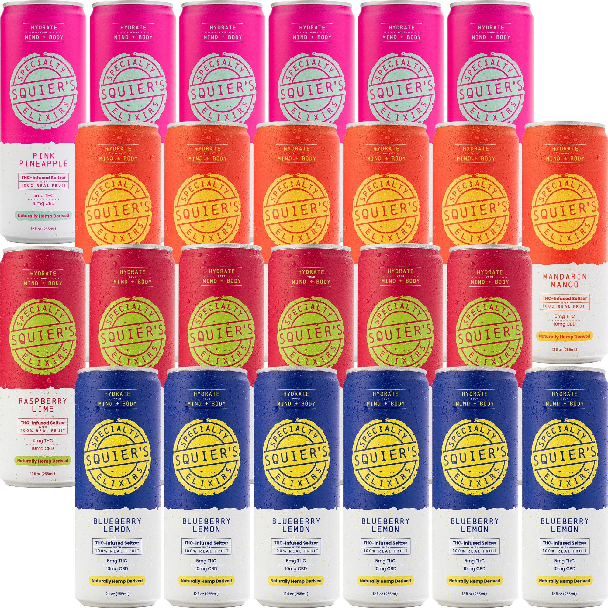Mandarin Mango: Carbonated Water, Lime Juice, Organic Blue Agave, Orange Juice, Tangerine, Puree, Mango, Pink Himalayan Salt, Hemp Extract, Organic Acacia Fiber (Prebiotic)